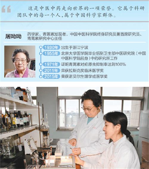 近幾年,屠呦呦兩度實(shí)現(xiàn)了中國(guó)本土科學(xué)家在國(guó)際獎(jiǎng)項(xiàng)上“零的突破”:2011年的拉斯克臨床醫(yī)學(xué)獎(jiǎng)和2015年的諾貝爾生理學(xué)或醫(yī)學(xué)獎(jiǎng)。但她公開表示,中醫(yī)中藥走向世界,榮譽(yù)屬于科研團(tuán)隊(duì)中的每一個(gè)人,屬于中國(guó)科學(xué)家群體。
