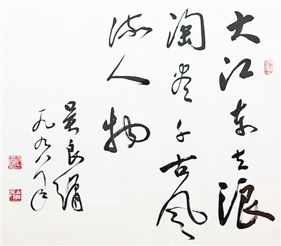 層層疊疊的文稿、繪畫、雕刻以及他的墨跡——“大江東去 浪淘盡 千古風流人物”,書法瀟灑流暢,飄逸大氣。這片空間,也淋漓盡致地體現他的人居環境理念——科學、人文、藝術三者融匯。