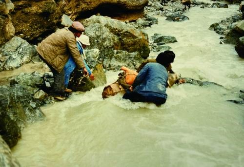 1987年7月,在去西昆侖山考察的路上遇到山洪,毛驢被沖到河里。受訪者供圖