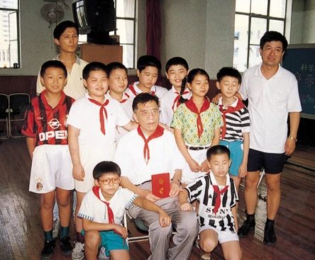 許學彥(中)被聘為江南小學校外科技輔導員,與師生合影。受訪者供圖