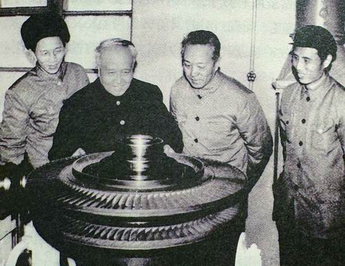 1968年,師昌緒(左二)等考察在410廠用808合金制作的(811)發(fā)動機渦輪盤。