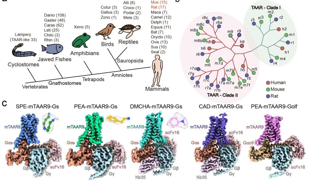 山東大學孫金鵬教授團隊和上海交通大學醫學院李乾研究員團隊合作,應用冷凍電鏡技術解析了TAAR家族成員之一的小鼠TAAR9(mTAAR9)受體在4種不同配體結合條件下與Gs/Golf(嗅覺特異性Gα)蛋白三聚體復合物的結構,進一步結合藥理學分析揭示了mTAAR9感知配體后被激活的分子機制。同時,該研究也提出了嗅覺受體“組合編碼”識別配體的結構機制,闡明了II類嗅覺受體獨特的激活方式。