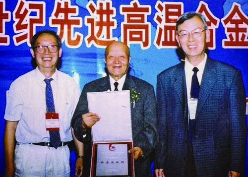 2004年,21世紀(jì)先進(jìn)高溫合金研討會授予師昌緒終身成就獎,從左至右為馮滌、師昌緒、仲增墉。
