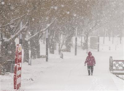 今年春天,我國北方多地出現大風降溫天氣。圖為4月12日,在黑龍江省呼瑪縣,市民在雪中出行。新華社發(褚福超攝)