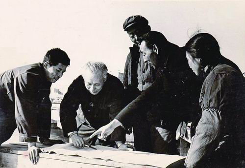 1975年,錢令希(左二)在鲇魚灣棧橋工地上