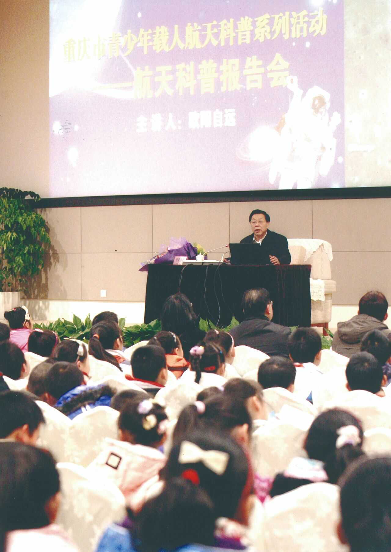 2010年,歐陽自遠(yuǎn)在重慶科技館作科普?qǐng)?bào)告。