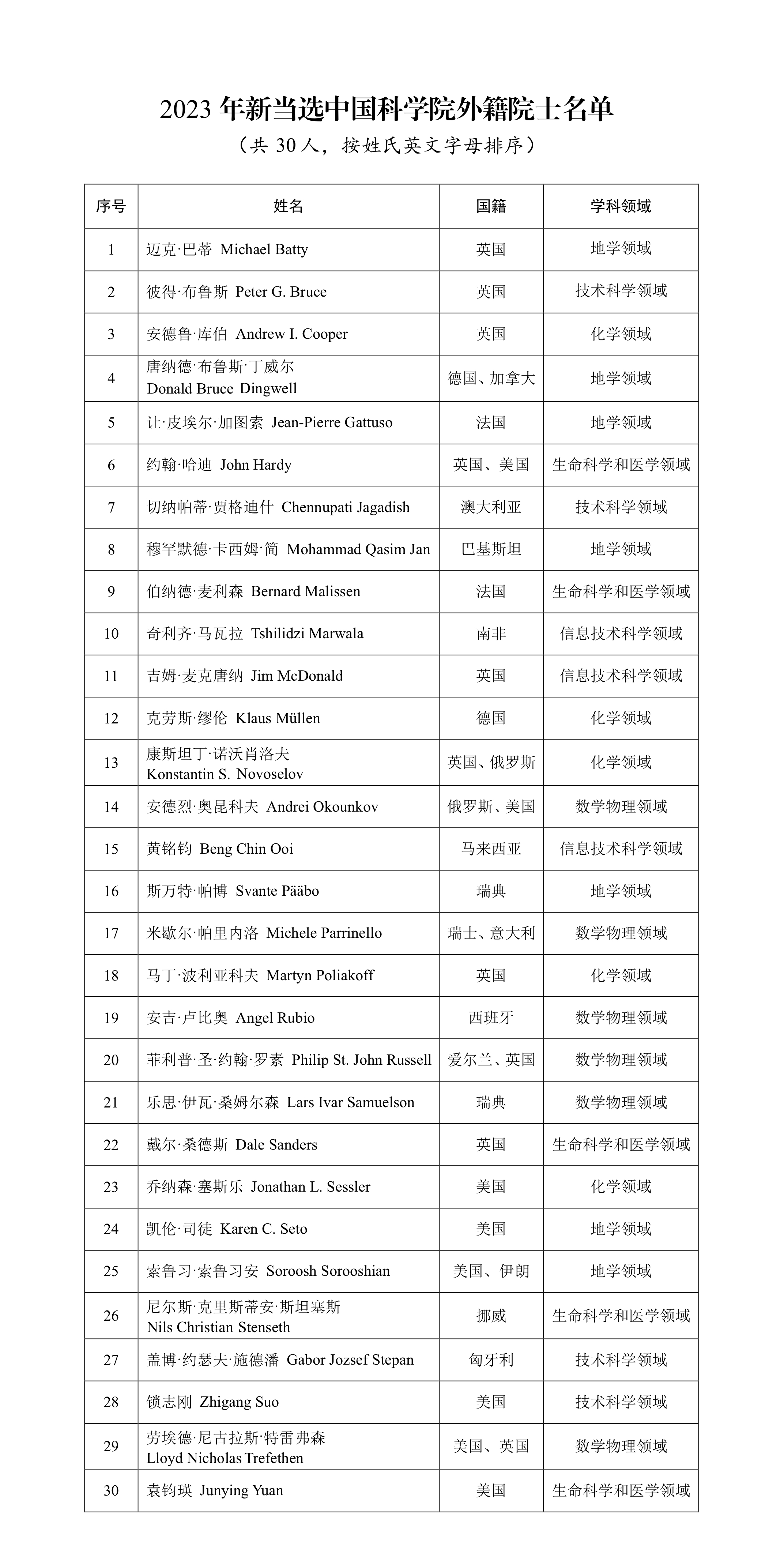 根據《中國科學院院士章程》《中國科學院外籍院士選舉辦法》等規定,2023年中國科學院選舉產生了30名中國科學院外籍院士。