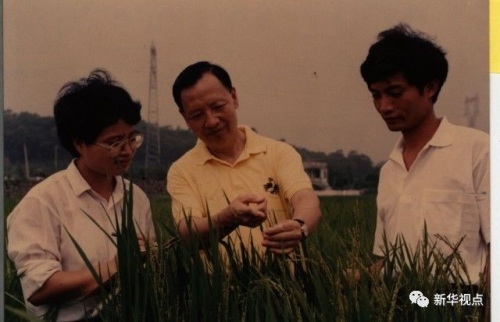 盧永根(中)在水稻試驗地指導博士研究生(資料照片)。