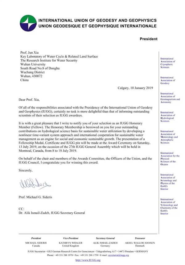 夏軍當選為國際大地測量與地球物理學聯合會會士