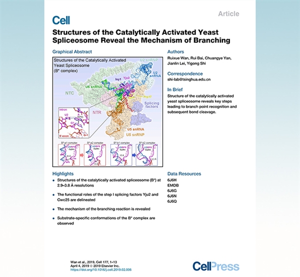 清華新聞網3月15日電 3月15日,清華大學生命學院施一公教授研究組就剪接體的機理與結構研究,于《細胞》(Cell)期刊發表題為《催化激活狀態的酵母剪接體結構揭示RNA剪接分支反應的機理》(Structures of the Catalytically Activated Yeast Spliceosome Reveal the Mechanism of Branching)的科研論文,揭示了剪接體第一步剪接反應前的瞬變狀態——催化激活剪接體(catalytically activated spliceosome,定義為“B*復合物”)4個不同構象的高分辨率三維結構,這是目前RNA剪接循環中最后一個未被解析的基本狀態。至此,施一公研究組成為世界上首個、也是唯一一個成功捕獲并解析了RNA剪接過程中所有完全組裝剪接體高分辨率三維結構系列成果的團隊。該文報道的這4個同一狀態卻不同構象的剪接體結構,整體分辨率為2.9埃-3.8埃,核心區域的分辨率高達2.7埃,是目前報道的最高分辨率剪接體結構,該結構首次揭示了第一步剪接反應發生過程中的動態變化,展現了剪接因子對于剪接反應發生的重要作用,第一次從結構信息中回答了剪接體對不同pre-mRNA底物識別的特異性等重要科學問題。