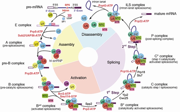 RNA剪接是真核生物基因表達調控的重要環節之一,其化學本質是兩步轉酯反應。這種看似簡單的化學反應在細胞中難以自行發生,而負責執行這一化學反應的是細胞核內一個巨大且高度動態變化的分子機器——剪接體(spliceosome)。從1977年首次發現RNA剪接至本世紀初,科學家們通過免疫沉淀、基因敲除、交聯質譜、建立體外剪接反應系統等研究手段,初步建立起剪接體的組裝、激活與解聚的發生過程,以及蛋白與蛋白、蛋白與核酸之間的相互作用、相互調控等復雜的RNA剪接調控網絡。在剪接反應過程中,多種蛋白-核酸復合物及剪接因子按照高度精確的順序發生結合、重排和解聚,依次形成預組裝復合物U4/U6.U5 Tri-snRNP(U4/U6.U5三小核核糖核蛋白復合物)以及至少8個狀態的完全組裝剪接體pre-B、B、Bact、B*、C、C*、P以及ILS復合物(圖1)。